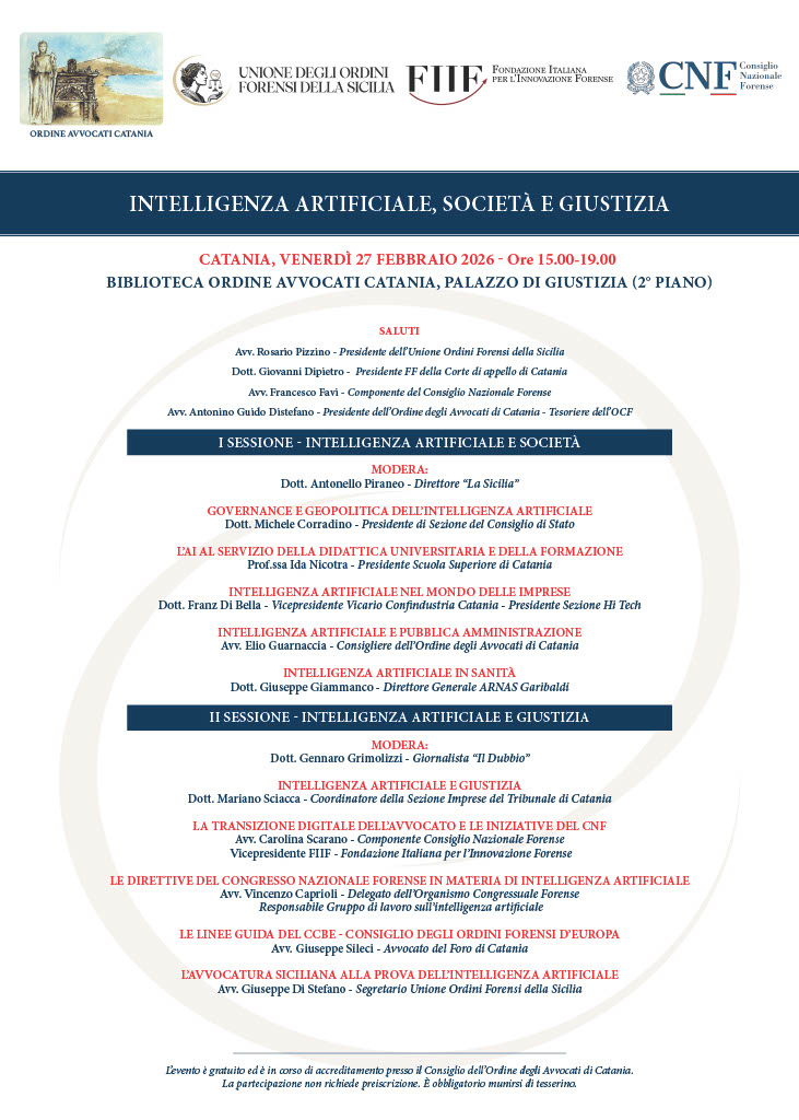 INTELLIGENZA ARTIFICIALE, SOCIETÁ E GIUSTIZIA. Catania 27 febbraio 2026 - ore 15:00 - Biblioteca Ordine Avvocati Catania - Palazzo di Giustizia